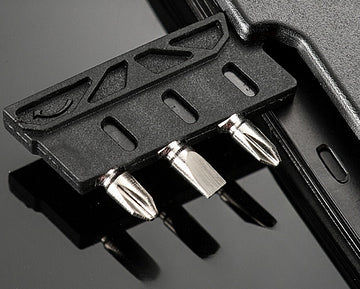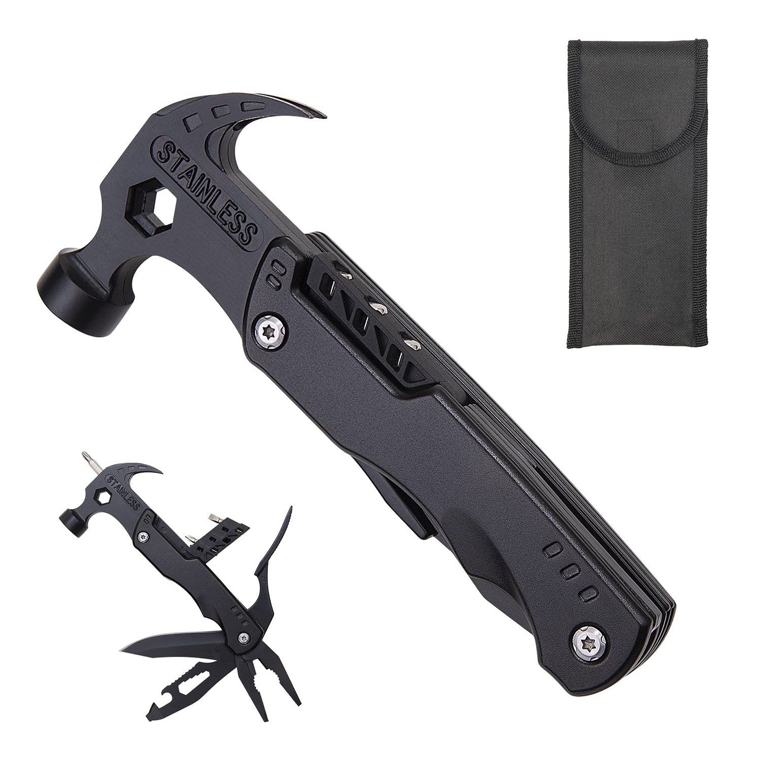 Funciones: Martillo, Cuchillo, Sierra, Alicates de corte y alicates universales, Destornilladores (planos y de cruz), Llaves hexagonales (grande y pequeña), Abrebotellas y abrelatas, Extractor de clavos, Pinzas, Taladro magnético y Orificio para colgar. -